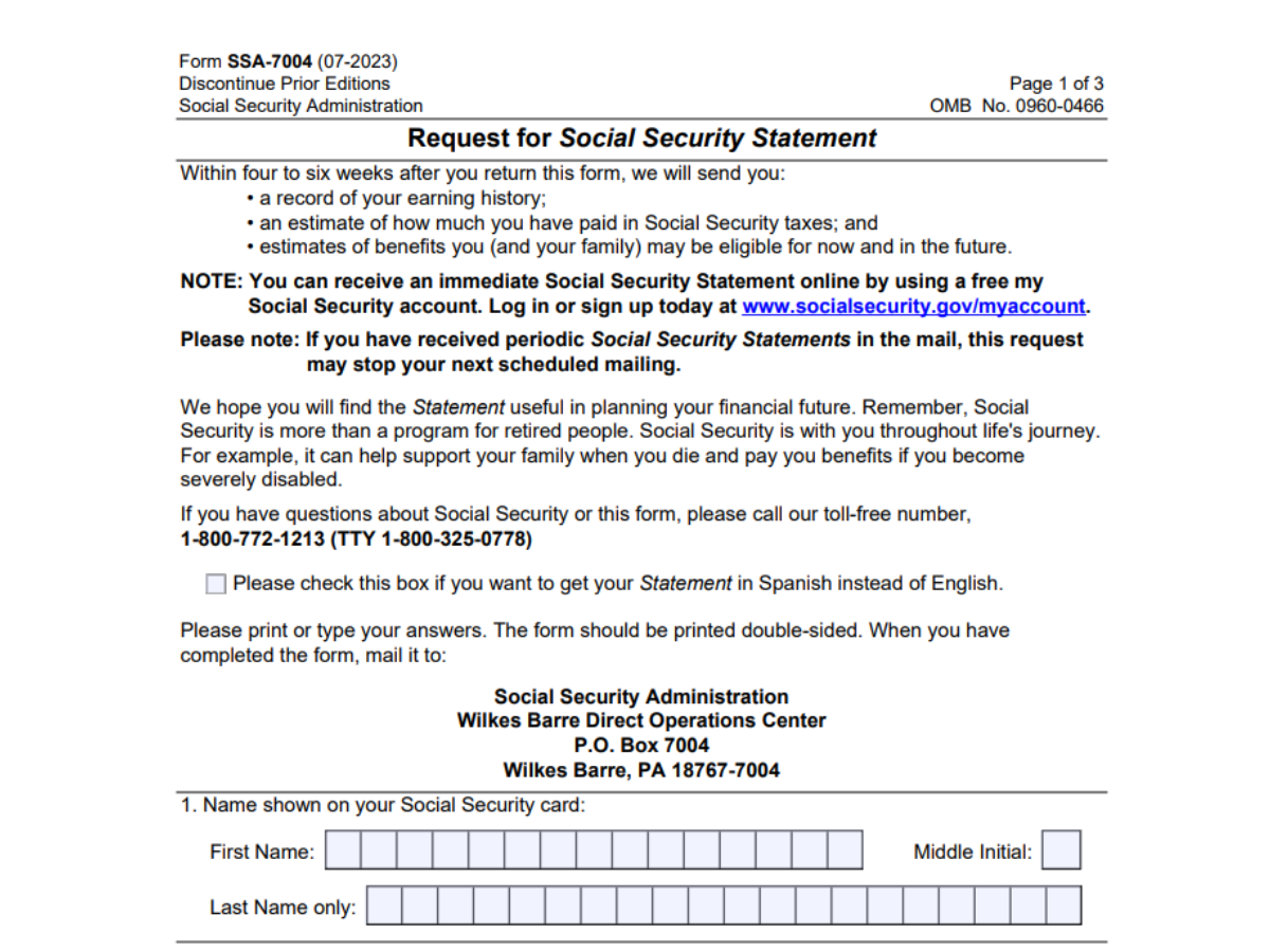 This is the form you need to request your Social Security Statement, a summary of your earning history and the benefits you may be eligible for.